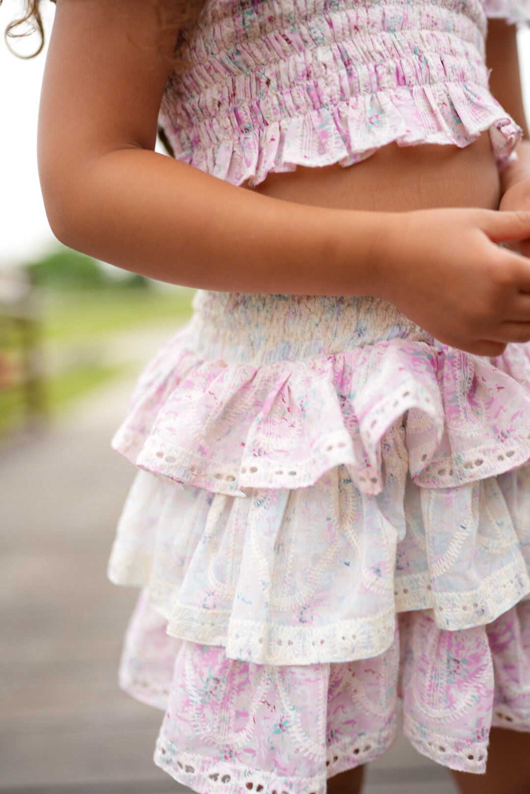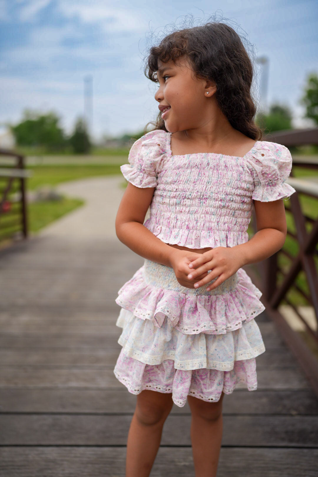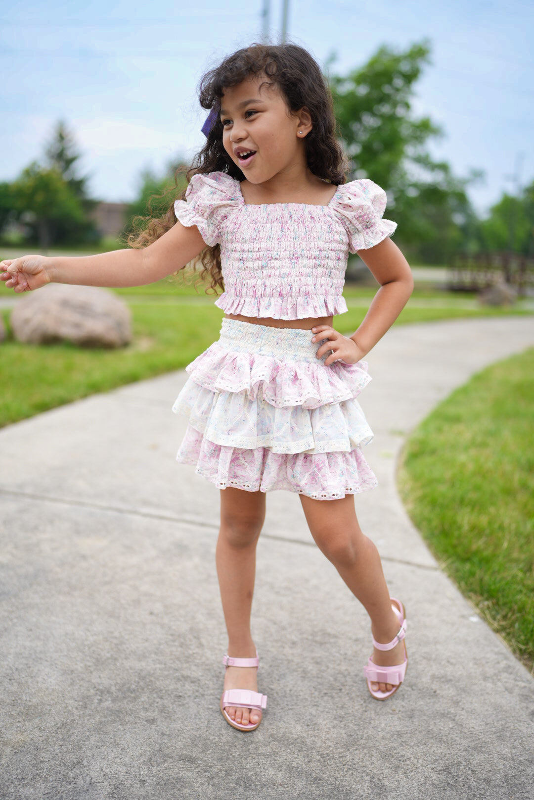 two-piece set includes smocked top and ruffled skirt