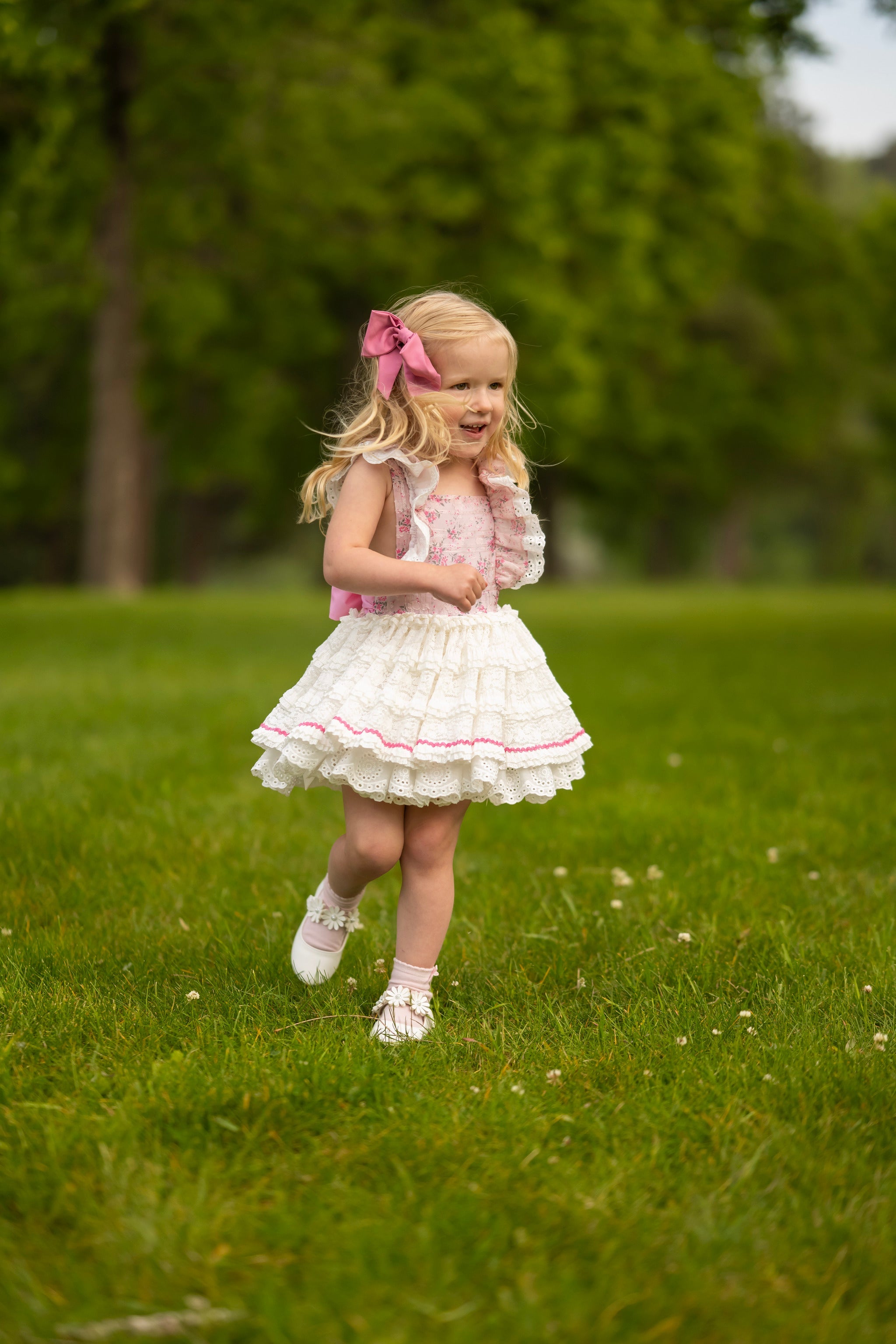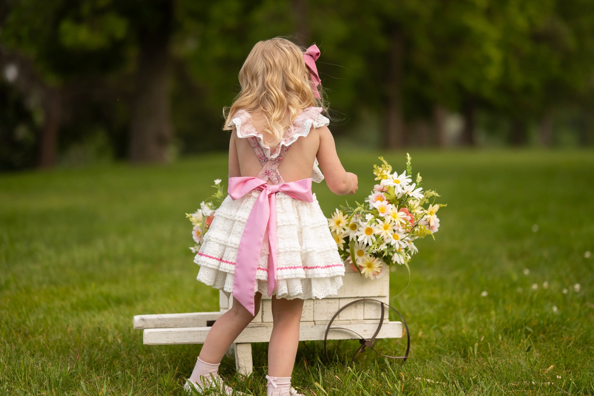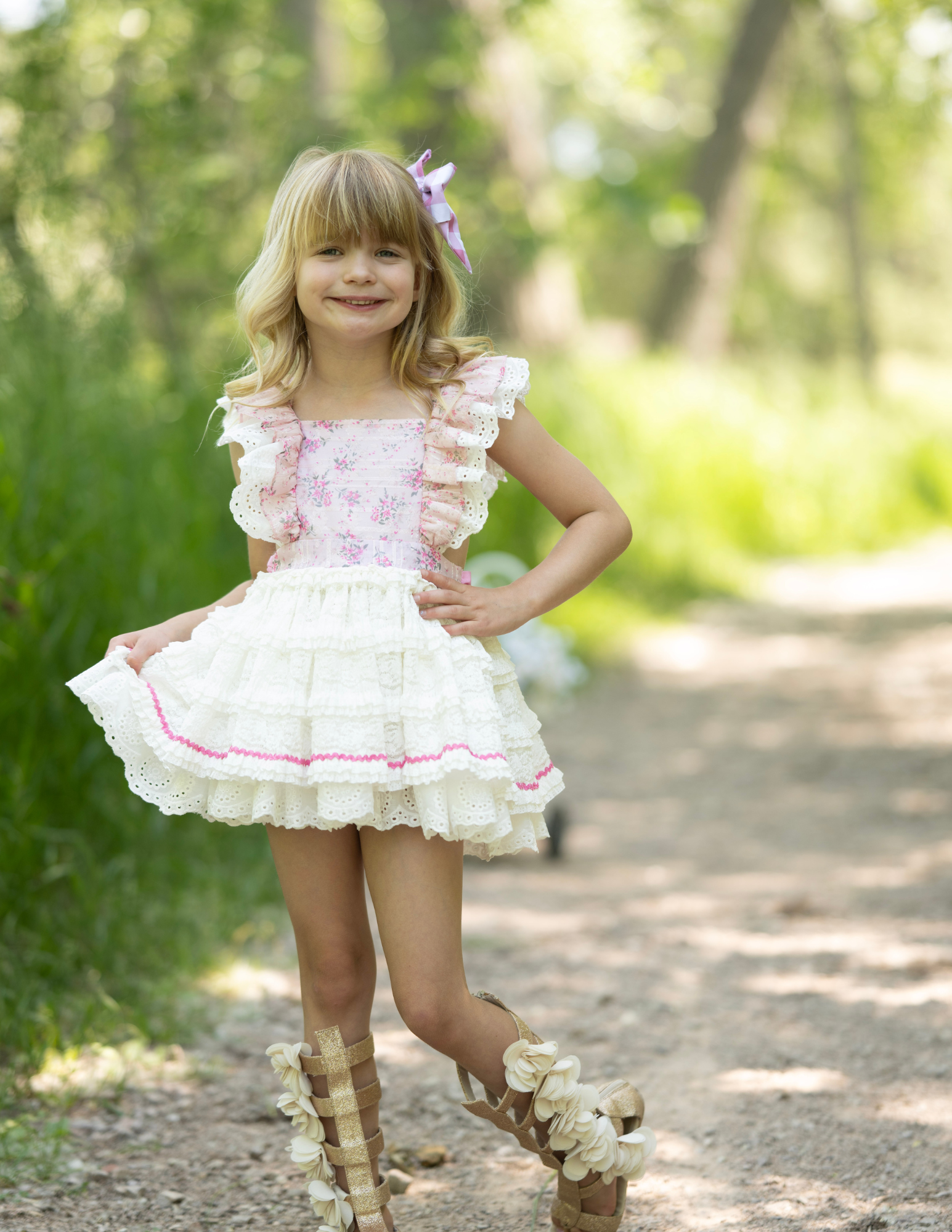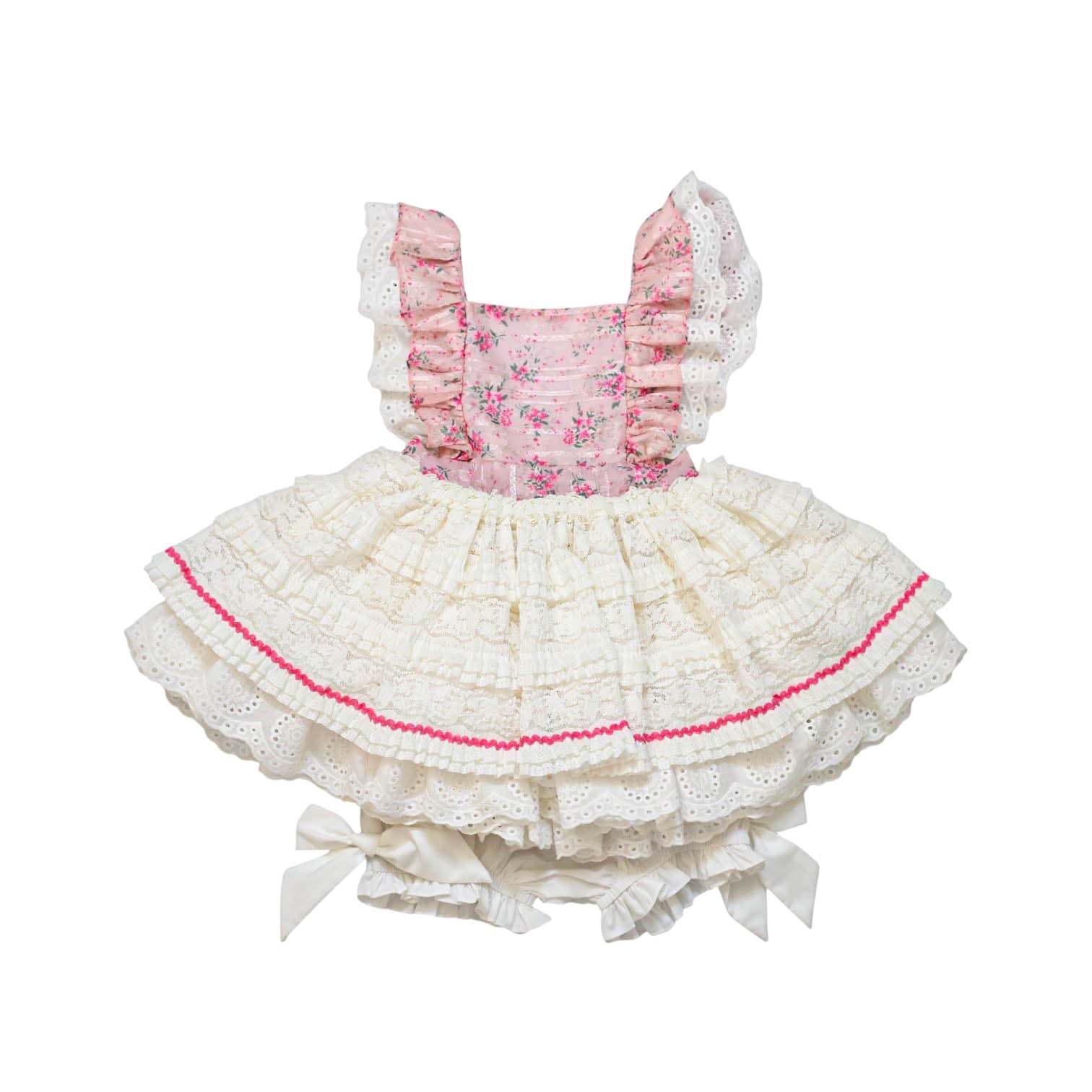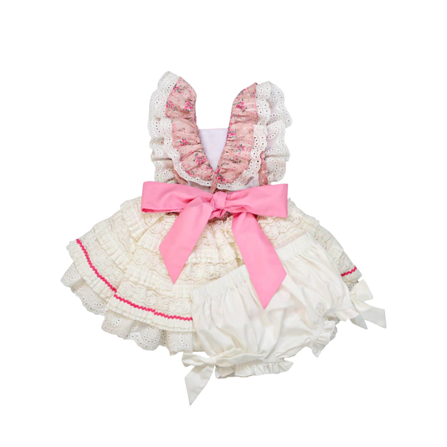 eyelet lace ruffles on straps that extend through the back