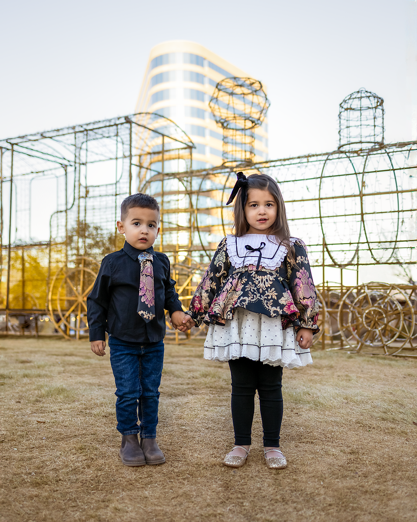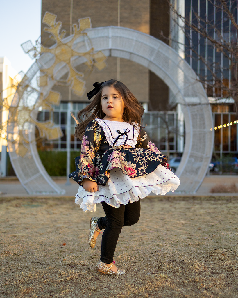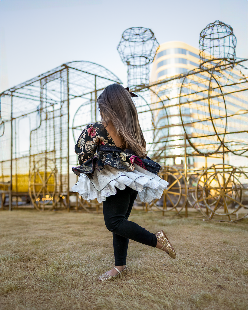 - Chiffon floral layer with a layer of eyelet lace underneath (three-layer skirt)
