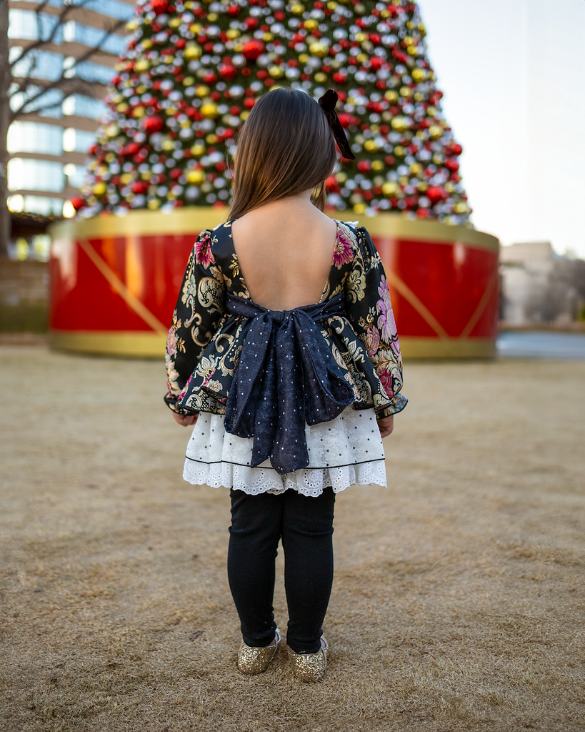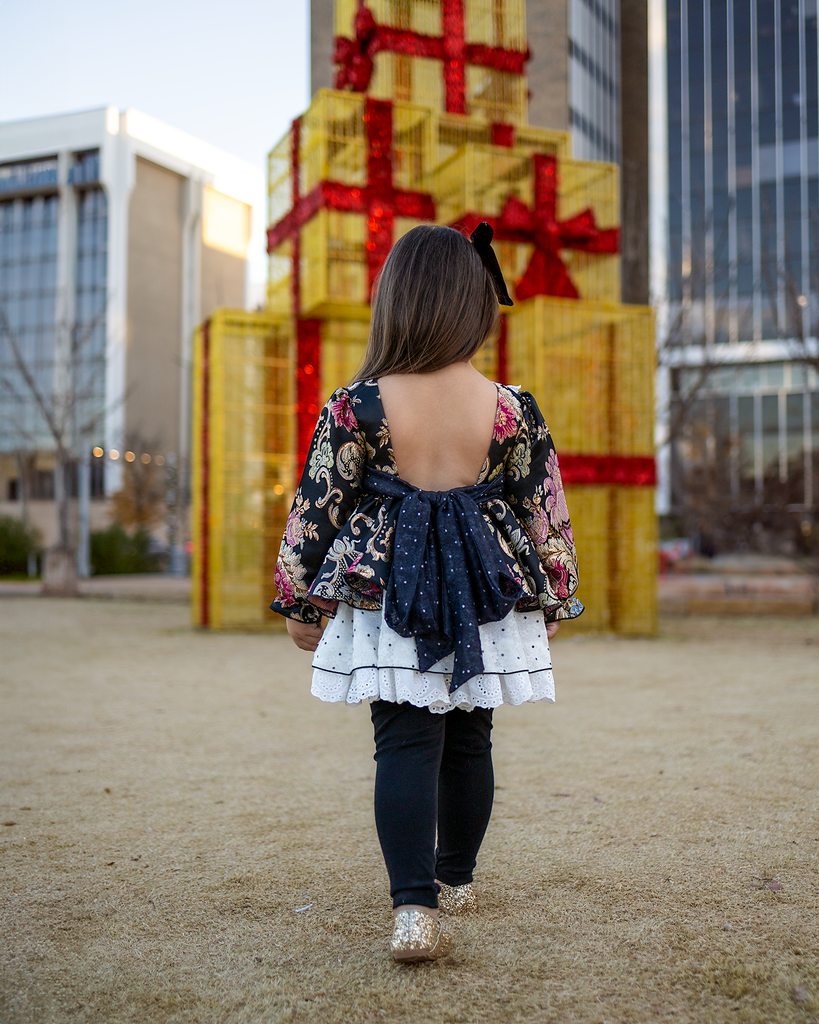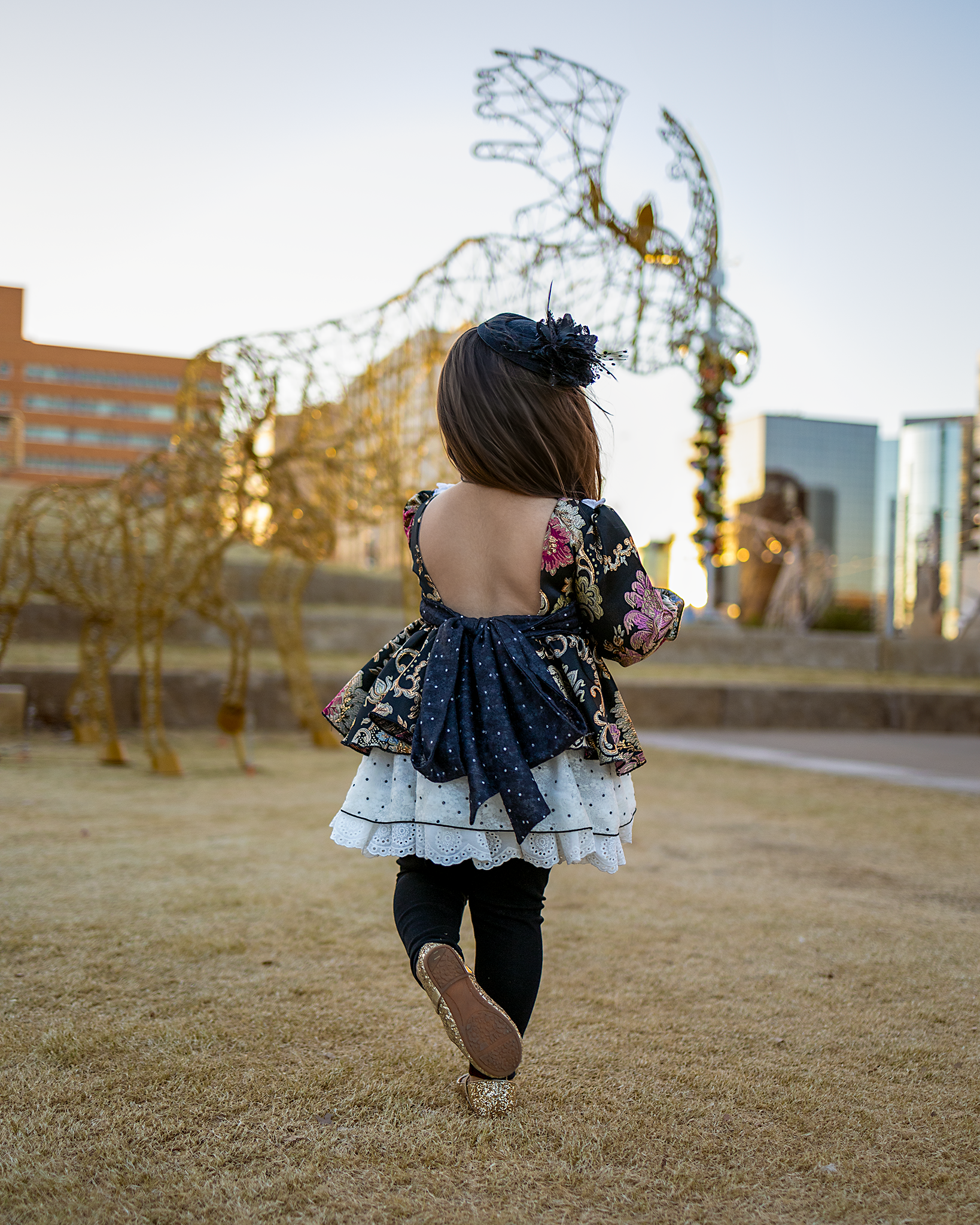 - Open back with a large oversized dramatic bow
